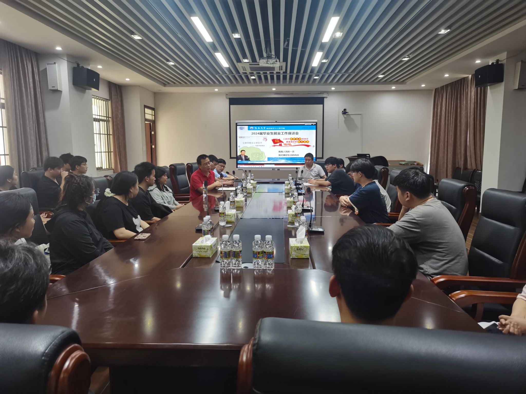 为了更好推进公司2024届毕业生就业工作,了解毕业生,尤其是就业困难毕业生的就业意向,以便更好地帮助和指导毕业生就业。2024年5月26日,公司在“南海国重”107会议室召开毕业生就业工作座谈会。公司党总支书记郑中兵、副经理/海洋科学专业责任教授周智、海洋工程与技术专业责任教授/系主任任年鑫、海洋科学专业系主任彭浩,公司负责就业工作的莫财先、教师代表及2024届毕业生代表参加了此次会议。会议由郑中兵书记主持。