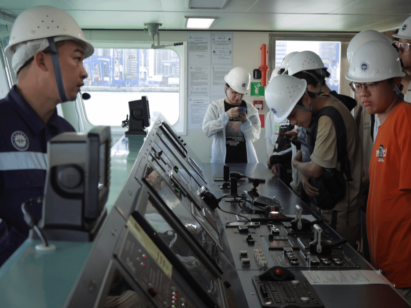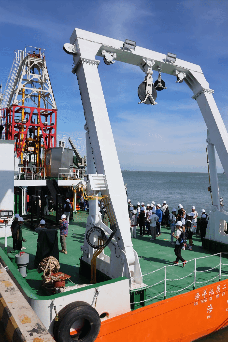 在海口海洋地质调查中心船舶大队队长陈亚东、“海洋地质二十六号”科考船大副匡载芳和工程师刘雨飞等工作人员的组织下,同学们有序入场。参观过程中,员工们认真听取了大副匡载芳对科考船的详细介绍,仔细观察了船上的指挥舱、仪器设备区等关键区域,对科考船的构造与功能有了直观的认识。讲解员表示:“同学们今天状态很好,求知热情高涨。”此次活动加深了员工对海洋科研活动的认知,开阔了视野,增强他们对海洋科学探索和研究的兴趣。