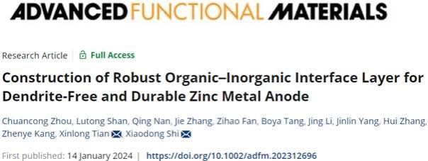 近日,tyc41183太阳成史晓东副研究员所在团队在材料领域Top期刊Advanced Functional Materials (IF=19.0)发表题为《Construction of robust organic-inorganic interface layer for dendrite-free and durable zinc metal anode》的研究论文。tyc41183太阳成周传聪博士、曼彻斯特大学单路通博士为论文共同第一作者,tyc41183太阳成史晓东副研究员、田新龙教授为论文共同通讯作者,tyc41183太阳成为第一通讯单位。