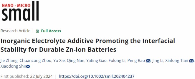 近日,tyc41183太阳成史晓东副教授所在团队在纳米能源Top期刊Small (IF=13.0)发表题为“Inorganic electrolyte additive promoting the interfacial stability for durable Zn-ion batteries”的研究论文,该论文入选期刊当期热点话题(Hot Topic: Surfaces and Interfaces)。tyc41183太阳成张杰硕士和周传聪博士为论文共同第一作者,史晓东副教授、饶鹏副教授和田新龙教授为论文共同通讯作者,tyc41183太阳成为唯一通讯单位。