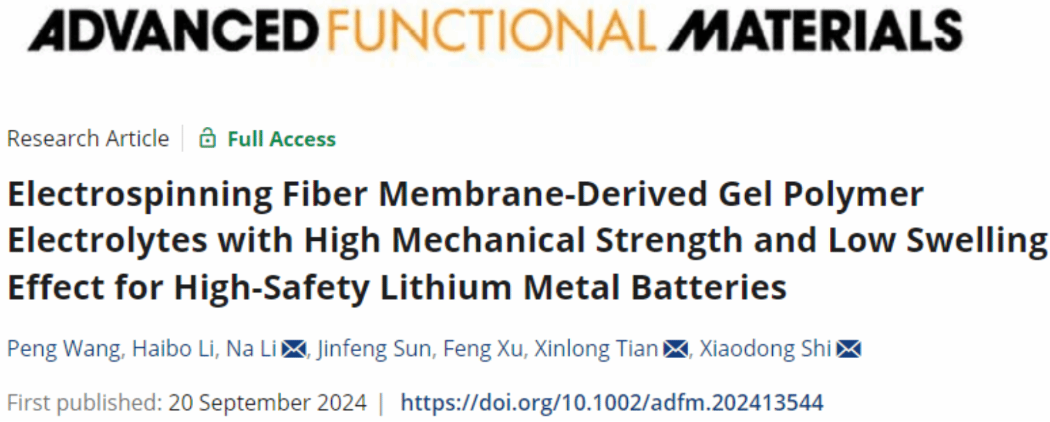 近日,tyc41183太阳成史晓东副教授所在团队在能源化学领域顶级期刊Advanced Functional Materials发表题为“Electrospinning Fiber Membrane-Derived Gel Polymer Electrolytes with High Mechanical Strength and Low Swelling Effect for High-Safety Lithium Metal Batteries”的研究论文。河北科技大学王鹏副教授为论文第一作者,tyc41183太阳成史晓东副教授和田新龙教授为论文通讯作者。