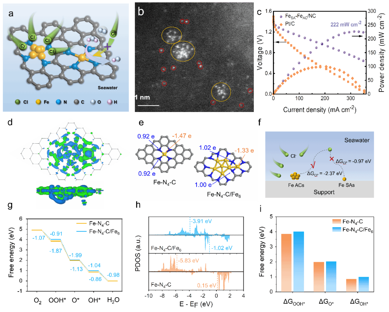本文提出了在高活性单原子位点附近可控构筑对Cl-具有强吸附能力的金属团簇位点,实现对单原子活性位点的有效保护。我们利用等离子体轰击策略制备了Fe原子簇(ACs)修饰Fe单原子(SAs)催化剂(FeSA-FeAC/NC)。FeSA-FeAC/NC在碱性海水电解液中展现出了优异的ORR催化性能,其半波电位高达0.886 V。当其作为阴极催化剂组装成S-ZABs时,该电池表现出卓越的放电性能,峰值功率密度达到222 mW cm-2,是基于Pt/C催化剂的S-ZABs的2.3倍。此外,密度泛函理论计算表明,FeAC的引入有效调节了FeSA的电子结构并降低了其周围Cl-的浓度,从而提高了催化剂的活性和稳定性。